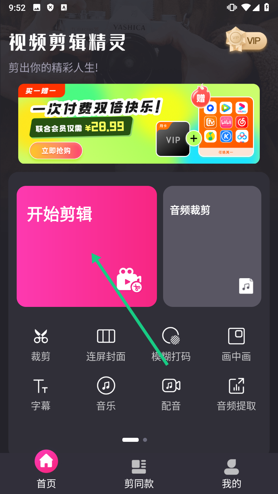 1、在视频剪辑精灵首页,点击【开始剪辑】,进入视频选择界面,开始视频剪辑操作。
