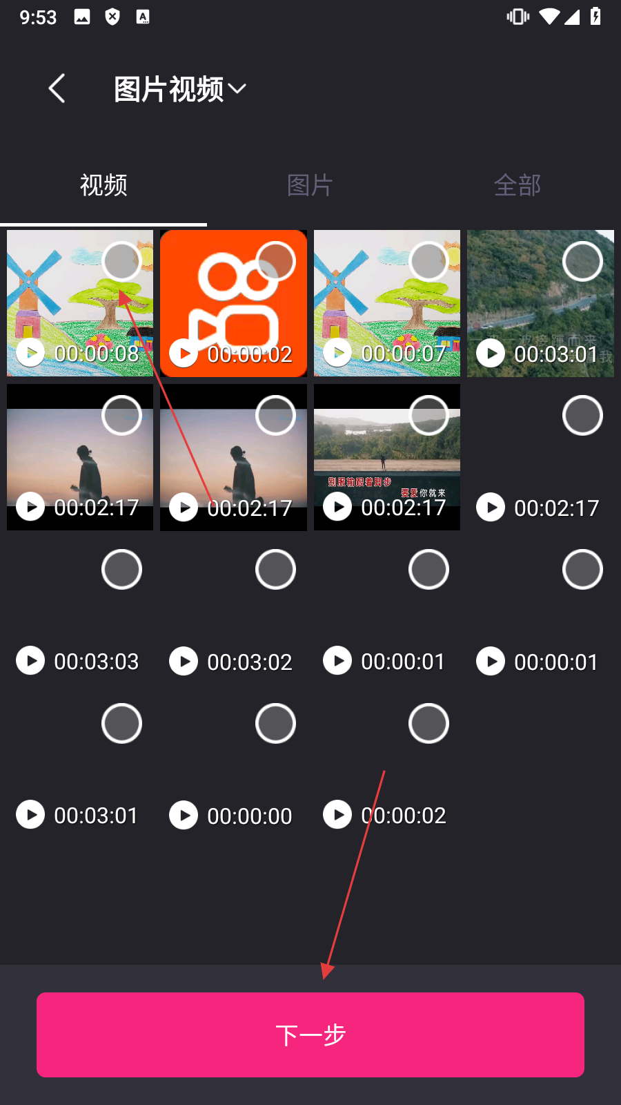2、进入视频选择界面后【选择要剪辑的视频】,点击【下一步】,进入视频编辑界面。