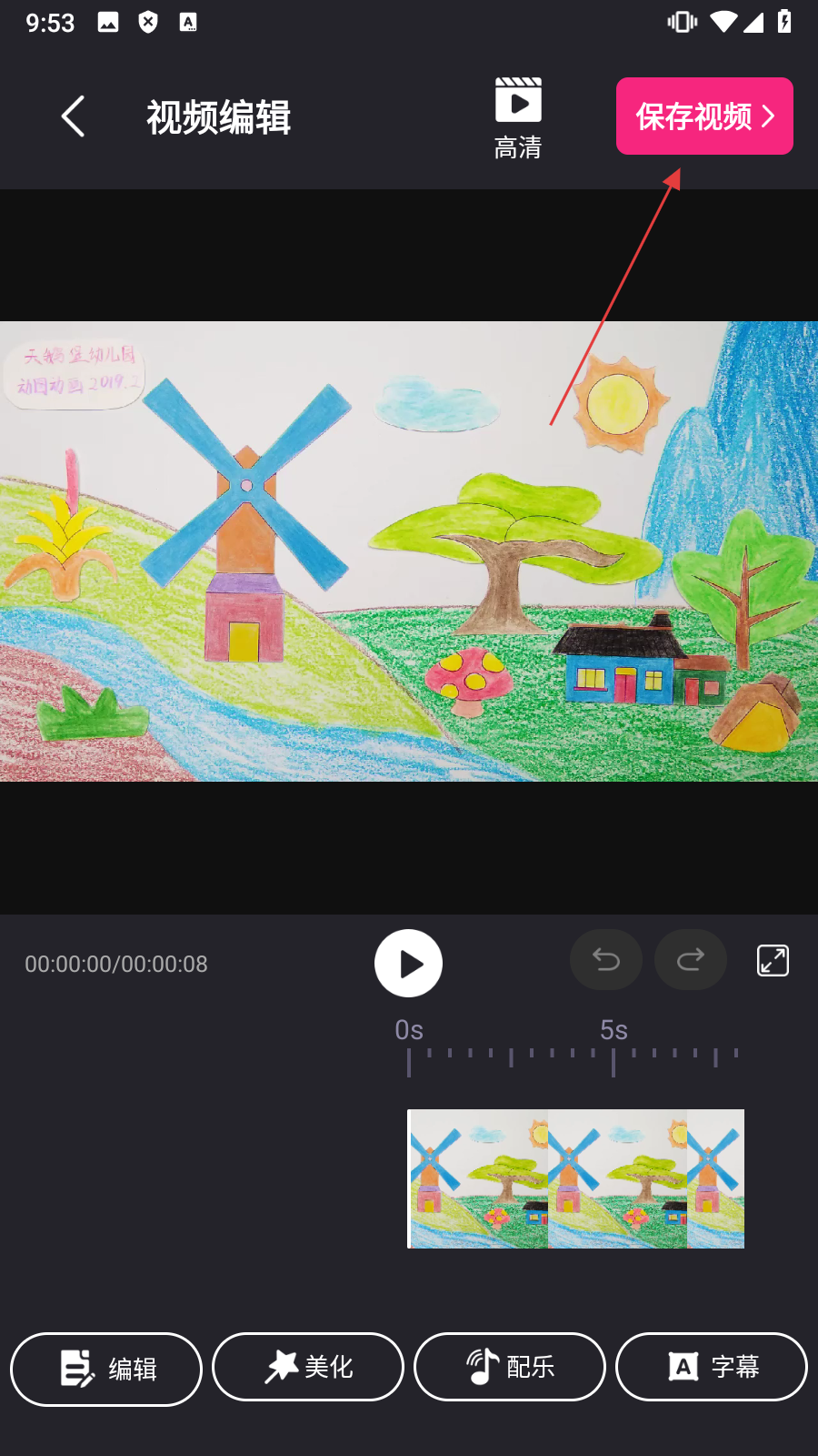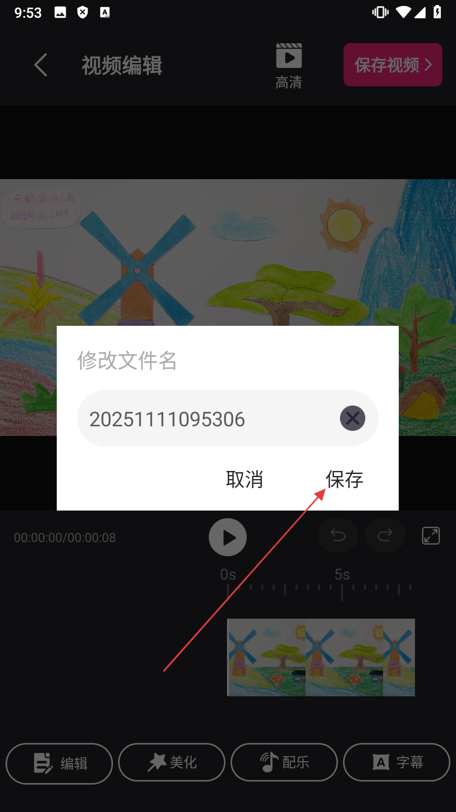 3、在视频编辑界面完成编辑后,点击【保存视频】,弹出修改文件名的提示框。