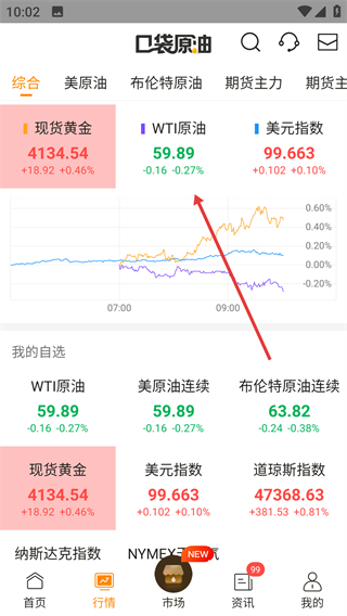 3、在行情页面选择目标原油类型,如【WTI原油】。