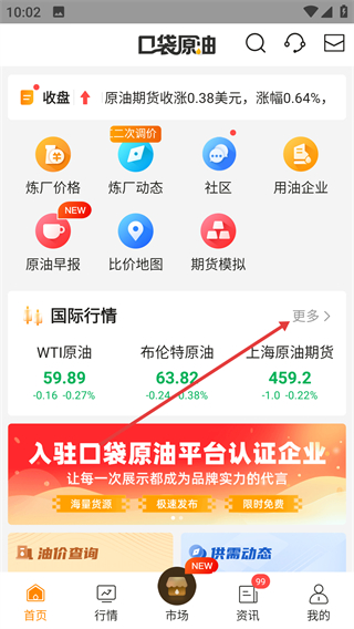 2、在首页点击【国际行情】板块的【更多】选项,进入行情页面。