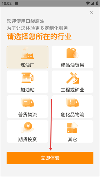 1、选择所在行业后,点击【立即体验】按钮,进入口袋原油首页。