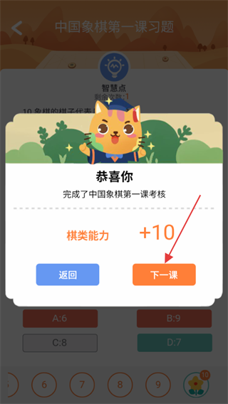 4、完成习题考核后,点击【下一课】可继续学习中国象棋后续课程。