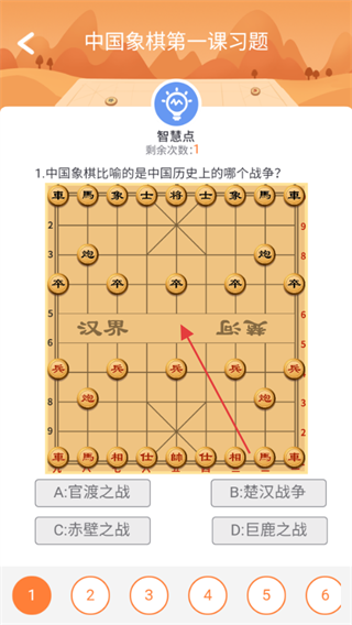 3、在习题页面完成中国象棋知识题目作答,如关于象棋历史战争的选择题。