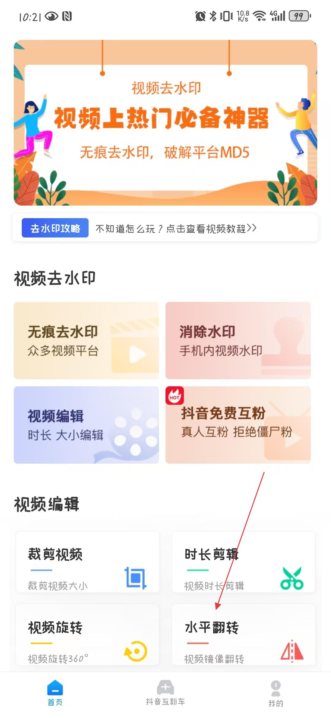 1、在软件首页点击【水平翻转】,进入视频选择界面,开始视频水平翻转操作。