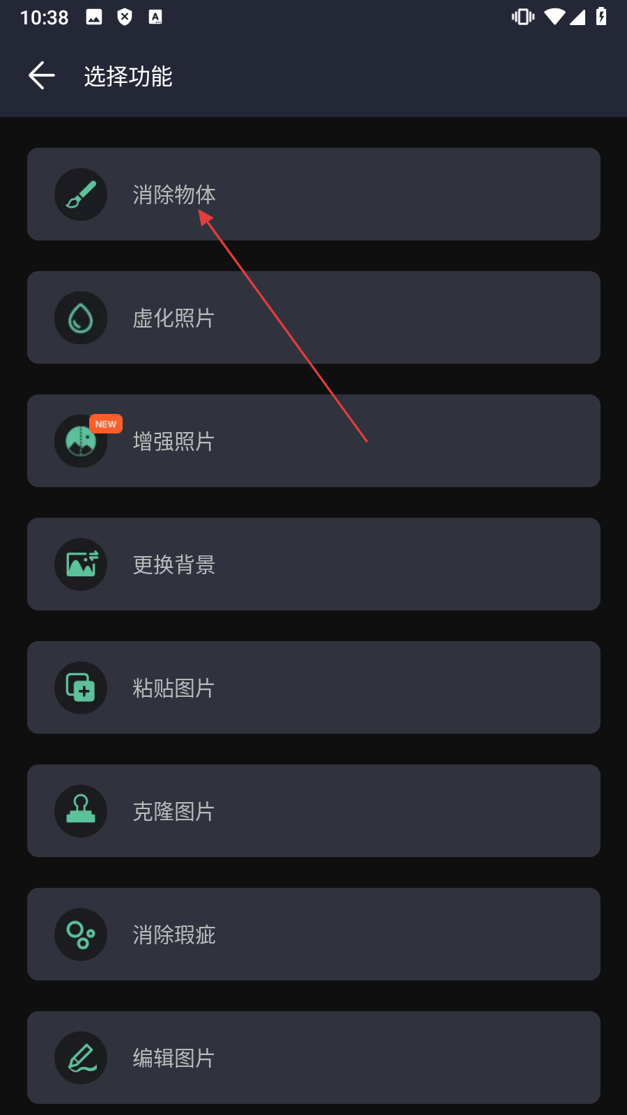 3、在功能选择界面点,击【消除物体】,进入照片消除物体编辑界面。