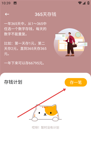 4、进入365天存钱页面,点击【存一笔】按钮,开始执行存钱计划。