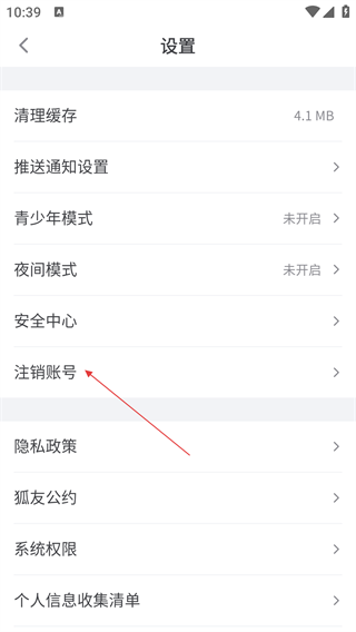 3、在设置页面点击【注销账号】,进入确认注销页面。