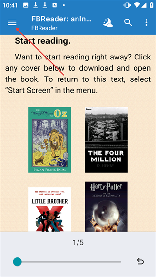 1、在FBReader主界面,点击左上角菜单按钮,展开功能菜单。