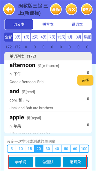 4、在单词学习页面,可选择【学单词】【做测试】【磨耳朵】等功能,还可设置单次学习或测试的单词量,进行单词学习。