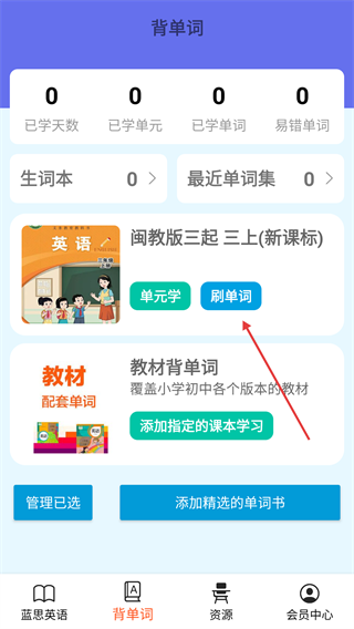 3、回到背单词界面,点击已添加教材旁的【刷单词】,进入单词学习页面。