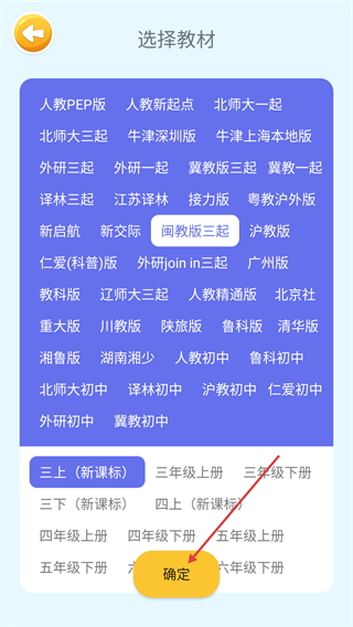 2、在选择教材页面,选择对应的教材版本和年级,点击【确定】。