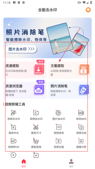 1、进入全能去水印首页,可【使用图片去水印、资源提取、文案提取】等功能,满足多种去水印与视频编辑需求。