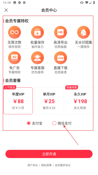 4、进入会员中心,可【查看会员专属特权】,购买后可享受无限次保存视频、免广告等会员服务。