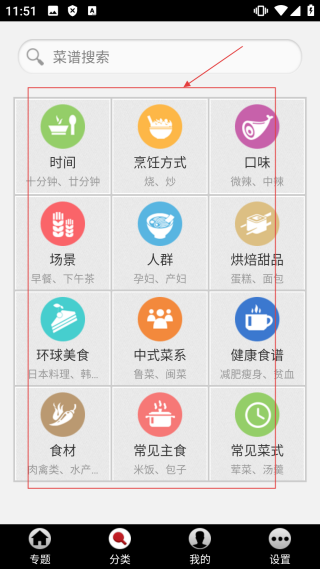 1、进入分类界面,可【搜索菜谱,选择时间、烹饪方式】等分类,开启美食探索之旅。
