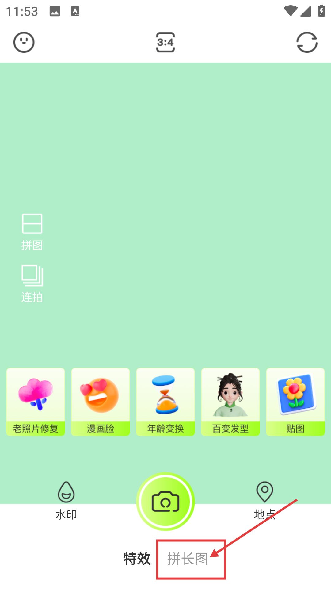 1、在APP主界面,点击【拼长图】选项,可进入图片拼接功能界面,开始制作长图。