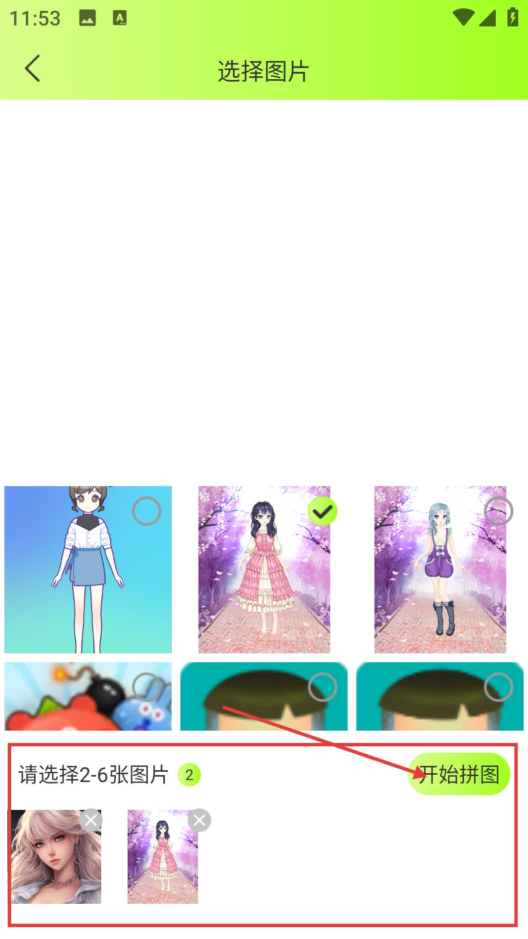 2、进入选择图片界面后,选择2-6张图片,选好后点击【开始拼图】,即可生成拼接长图。