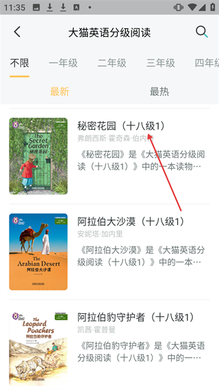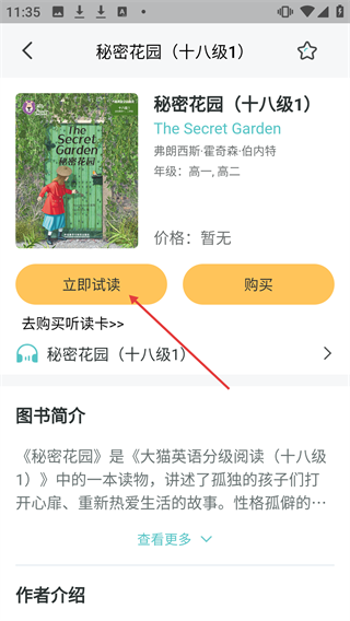 3、在大猫英语分级阅读列表中,点击《秘密花园(十八级1)》,进入其详情页进行试读或购买操作。