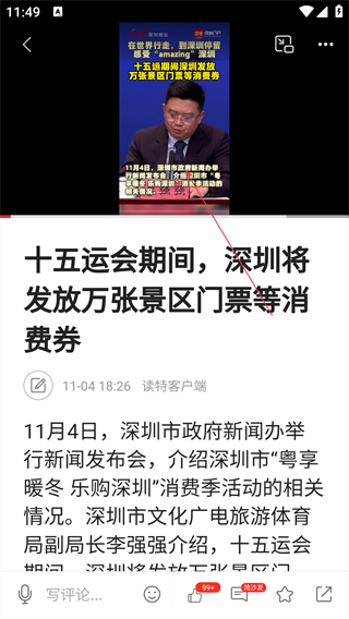 4、点击新闻视频进入详情页,可查看新闻文字内容,还可参与评论、点赞等互动。