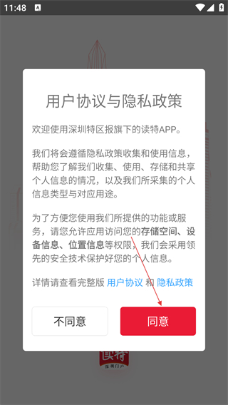 1、阅读【用户协议与隐私政策】,点击【同意】进入。