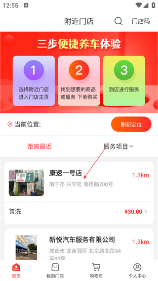 1、在首页中,在附近门店列表中选择目标门店,如【康速一号店】。