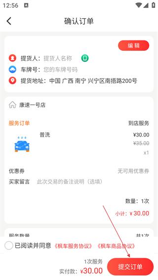 4、在确认订单页填写提货人、车牌号等信息,勾选协议后点击【提交订单】完成购买。