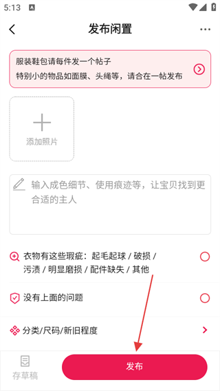 4、添加闲置物品照片,输入成色细节、使用痕迹等信息后,点击【发布】即可完成闲置发布。