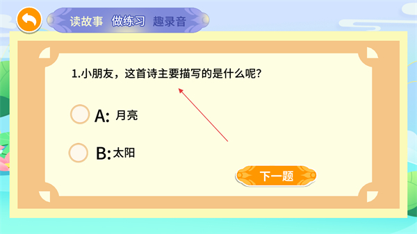 4、在练习页面完成古诗相关题目作答,如关于古诗描写对象的选择题,点击【下一题】可继续练习。
