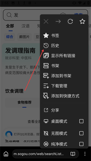 2、在展开的功能菜单中点击【历史】,进入历史记录界面。