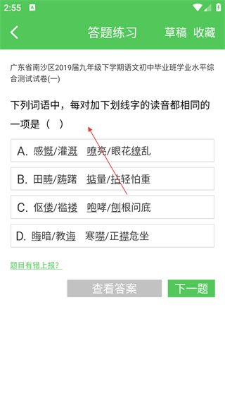 4、进入答题练习页面后,完成题目作答,可点击【下一题】继续练习。