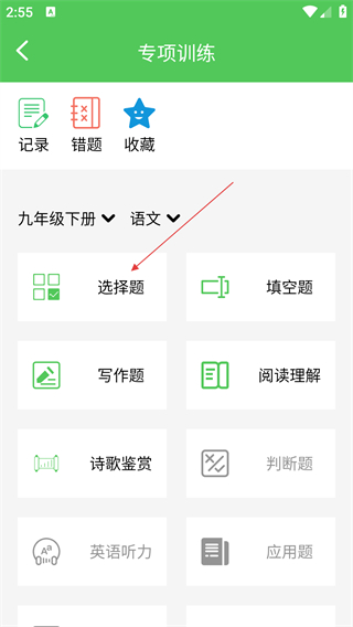 3、在专项训练页面,选择年级、学科及题型,如九年级下册语文的【选择题】。