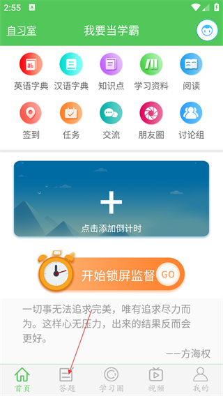1、在APP底部点击【答题】,进入题王争霸赛页面。