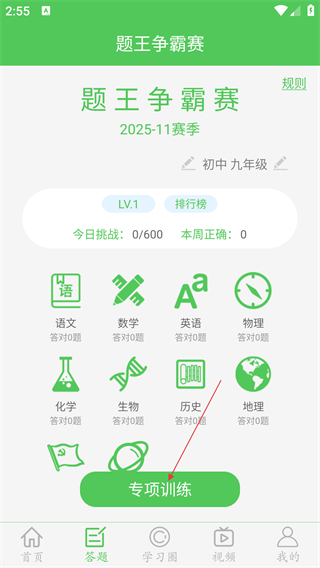 2、在题王争霸赛页面,点击【专项训练】,进入专项训练页面。