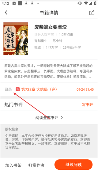 2、在《废柴嫡女要虐渣》书籍详情页点击【目录】,进入目录页面。