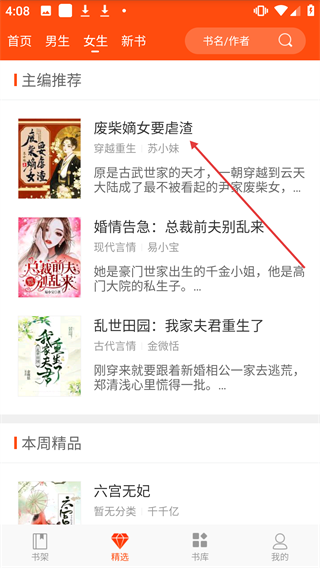 1、在女生频道的主编推荐中点击【废柴嫡女要虐渣】,进入书籍详情页。