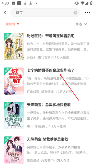 3、在搜索结果中点击《七个病娇哥哥的金丝雀炸毛了》,进入该小说阅读页面。