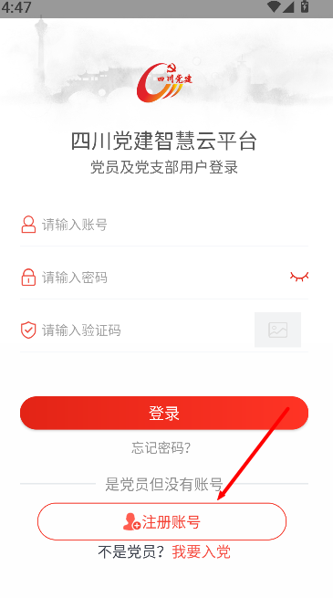 1、打开《四川党建》软件后,点击首页的“注册账号”按钮进入注册页面。