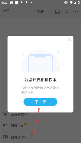 3、在相机权限提示框中点击【下一步】,开启相机权限以支持图片转文字功能。