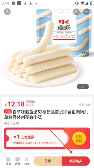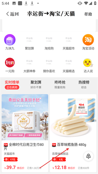 2、在幸运街→淘宝/天猫页面中点击【百草味鳕鱼肠】商品,进入详情页。