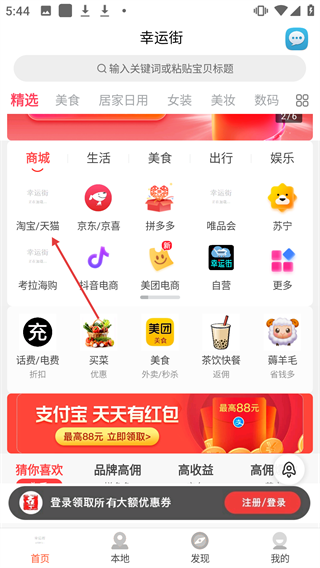 1、在幸运街首页点击【淘宝/天猫】图标,进入淘宝/天猫板块。