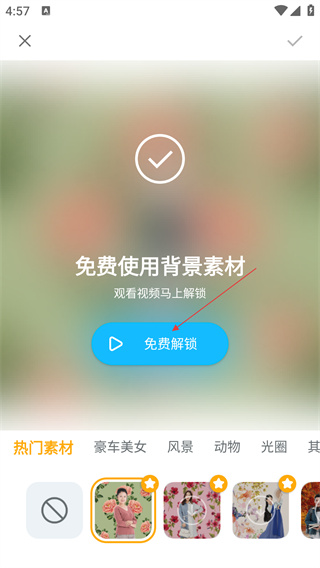 3、在背景素材解锁页面点击【免费解锁】按钮,观看视频后解锁背景素材。