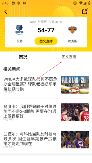 3、在赛事详情界面,点击【图文直播】,进入图文直播界面。