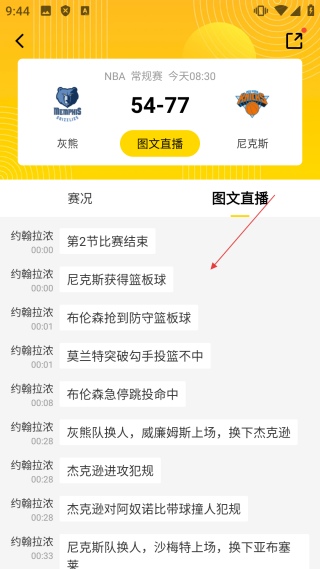 4、在图文直播界面,即可【查看赛事的实时直播信息】,完成赛事直播查看操作。