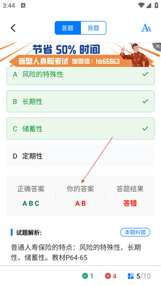 4、提交答案后可查看正确答案、个人答案及答题结果,还可查看试题解析以巩固知识。