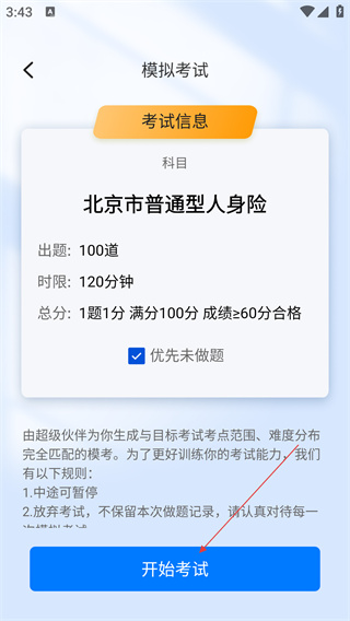 2、在模拟考试信息页核对考试信息后,点击【开始考试】按钮进入答题环节。
