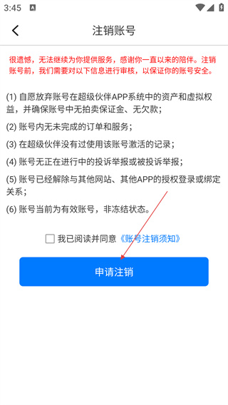 4、在注销账号说明页勾选同意《账号注销须知》后,点击【申请注销】按钮完成账号注销操作。
