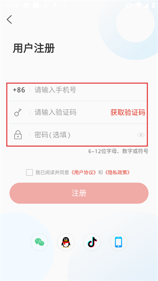 4、在用户注册页面填写【请输入手机号】【请输入验证码】【密码(选填)】后,点击注册。