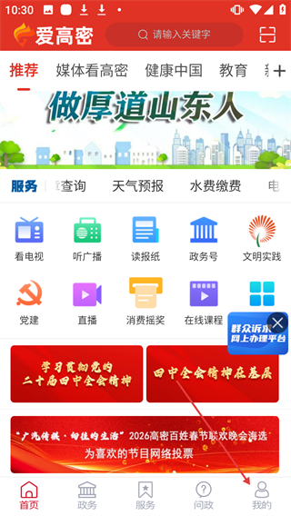 爱高密app下载是高密市融媒体中心打造的本地综合服务移动客户端,聚焦新闻资讯传播、政务服务延伸与便民生活赋能,推动传统媒体与新兴媒体深度融合。它整合本地最新时政民生资讯、特色电视直播与回放、在线政务办理、便民生活服务等核心资源,用户可实时获取权威政策信息、收看本地电视频道,还能通过在线问政反映诉求、掌上办理政务业务。