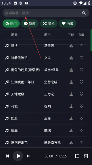 1、在软件界面【点击搜索框】,进入搜索界面,输入要查找的歌曲或歌手关键词。