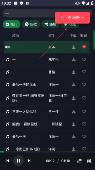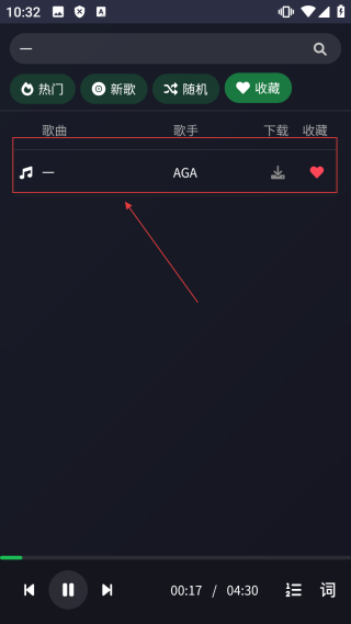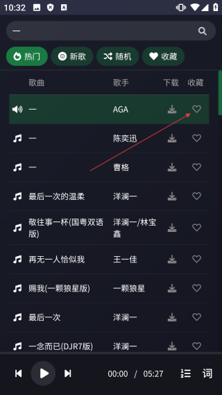 2、进入搜索结果界面后【点击目标歌曲的收藏图标】,进行歌曲收藏操作。
